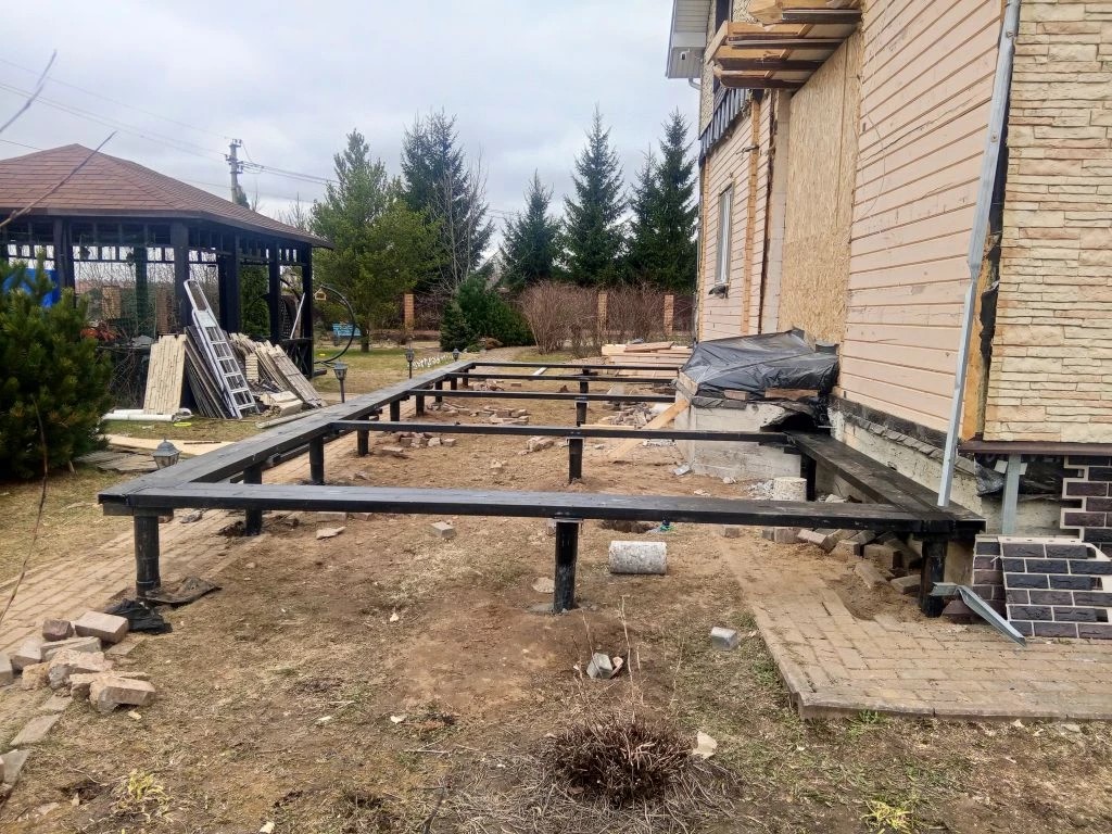 Работа началась с детального изучения участка и технического задания. Учитывая, что стены веранды будут возводиться из тяжелого оцилиндрованного бревна в сочетании с масштабными стеклянными конструкциями, мы произвели расчет необходимого количества точек опоры. Для обеспечения максимальной жесткости было решено использовать 15 винтовых свай. Длина каждой сваи составила 3 метра, что позволило надежно пройти уровень промерзания почвы и закрепиться в плотных слоях грунта. Это гарантирует, что весна и сезонное пучение земли не повредят дорогостоящее остекление.