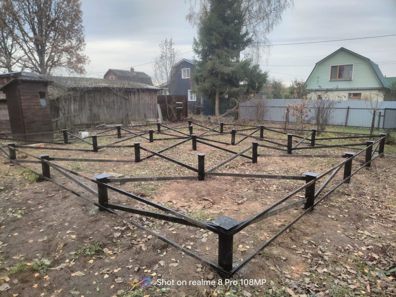 —Свайно-винтовой фундамент с укосинами и обвязкой профильной трубой